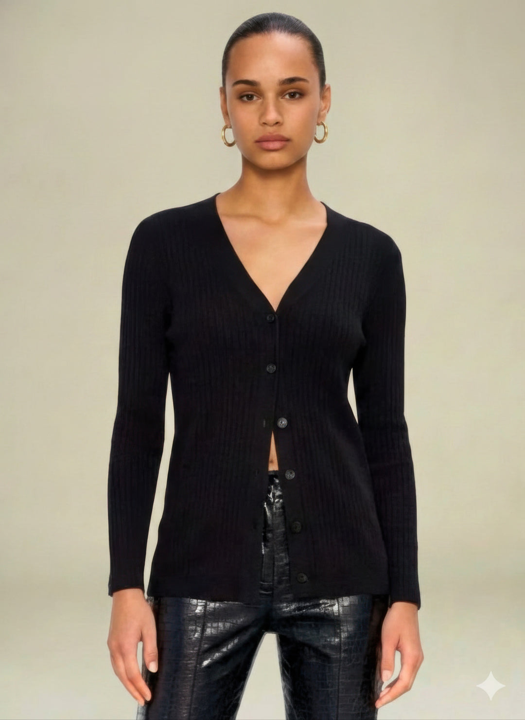 Python effect faux suede with stretch. Long sleeve. Button up front. Tailored fit. Size up for jacket-like look.