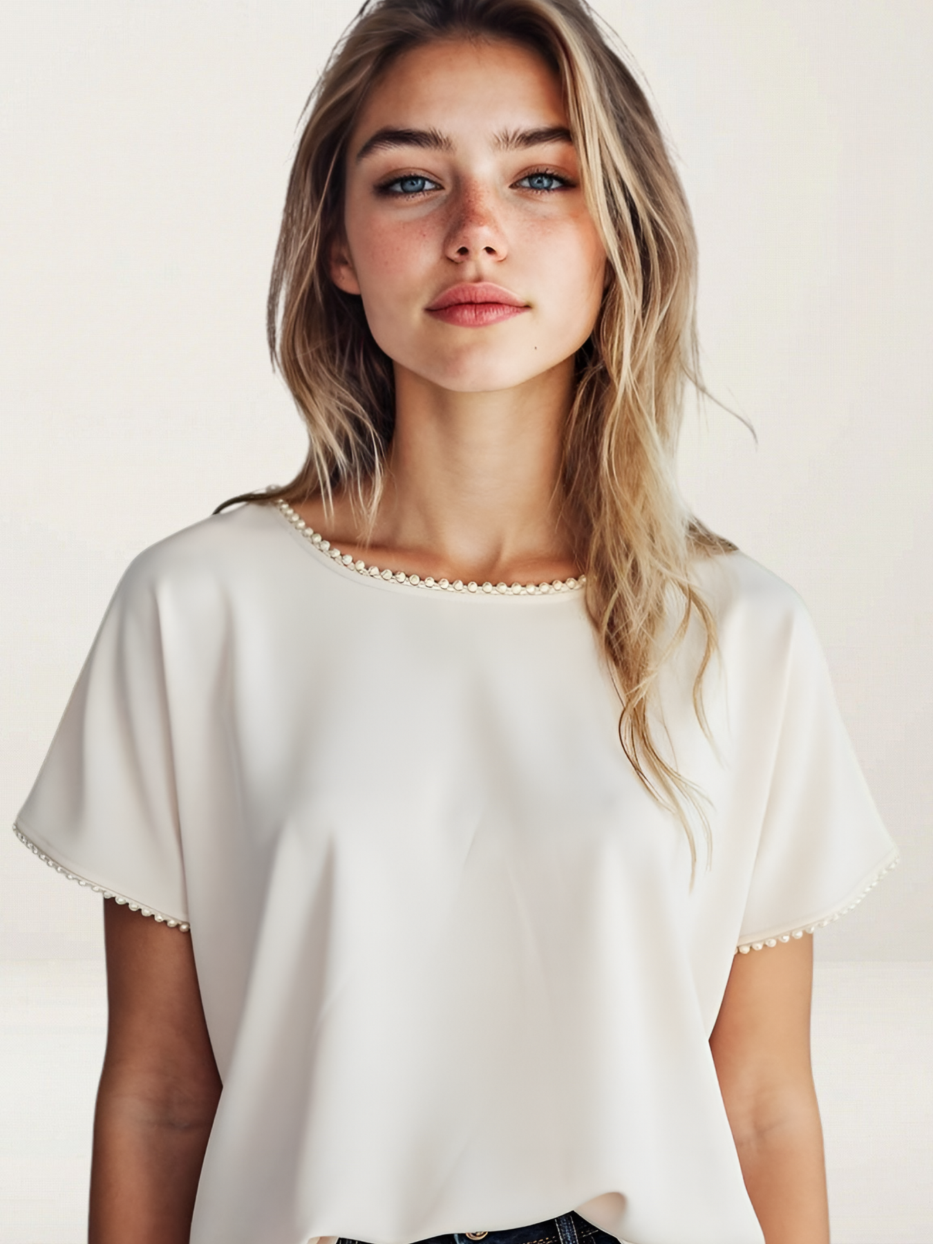 Crafted from our lightweight luxury knit fabric, this top with a metal stud trim top is the perfect elevated basic for your closet. Cut with a slight boxy fit with dropped shoulders and short sleeves to relax the silhouette. In Black and Pearl.