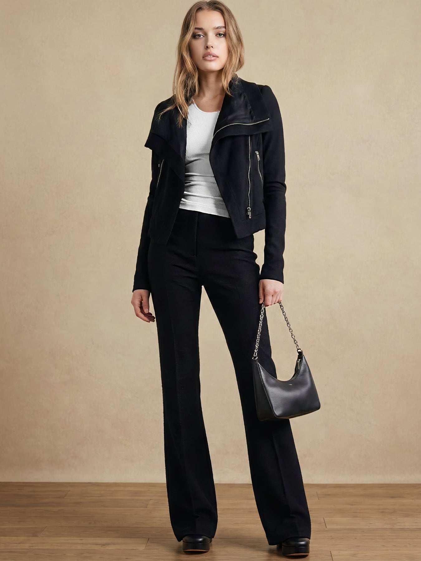 Light weight Italian-style biker jacket made from extremely soft vegan sueded leather. Luxurious double layer collar. Asymmetric zip front, easy pockets, zipper cuffs. Smooth and light weight to make layering easy.