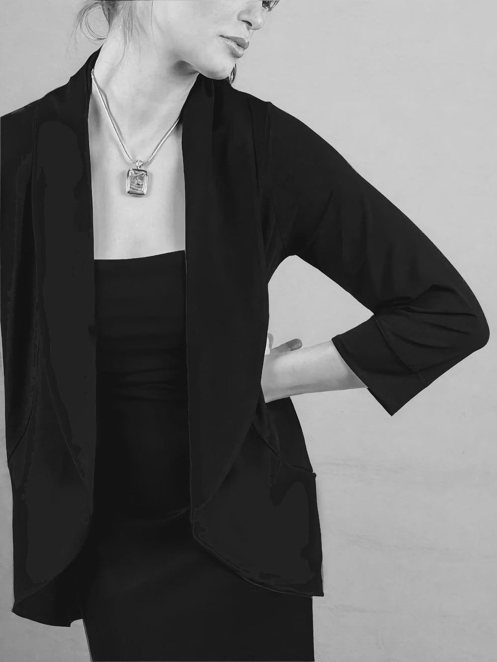 Flowing lightweight stretch-jersey jacket. Tailoring details in front and back. With pockets. Wear with our jersey Christopher slim leg or Liberty wide leg pants.